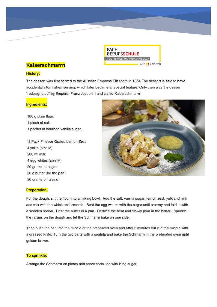 The dessert was first served to the Austrian Empress Elisabeth in 1854. The dessert is said to have accidentally torn when serving, which later became a special feature. Only then was the dessert “redesignated” by Emperor Franz Joseph I and called Kaiserschmarrn.